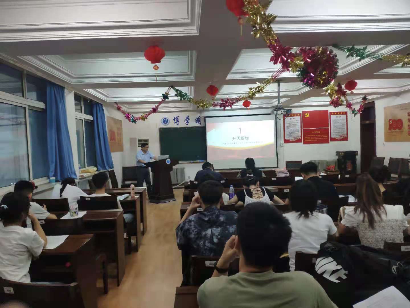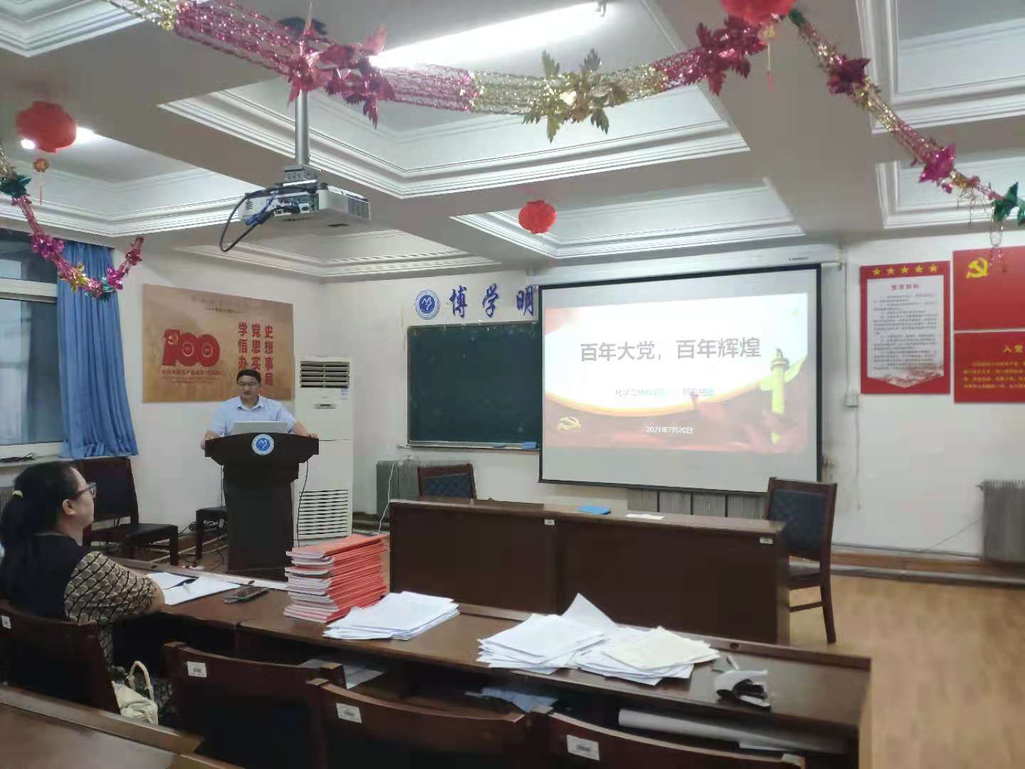 7月20日晚上,化学与材料学院党委副书记昭日格图在西拉木伦校区树人楼五楼会议室以《百年大党、百年辉煌》为题为学院学生党支部全体师生党员讲授了党史学习教育专题党课。